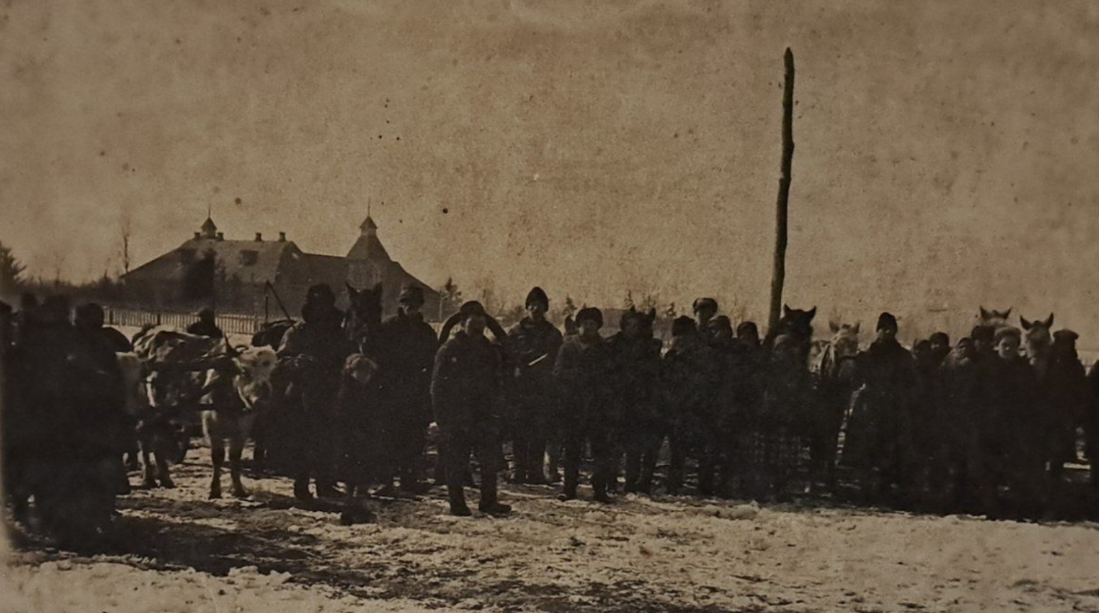 Зібрання варвинчан на вигоні. Позаду — земська школа